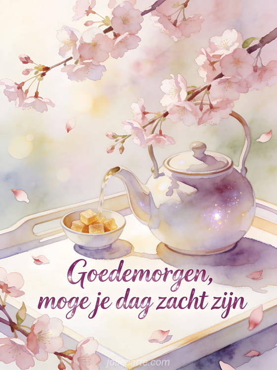 Stuur een zachte goedemorgen kaart met een keramische theepot die schenkt naast kersenbloesemtakken en een kleine kom met gouden suikerklontjes op een helder ontbijtdienblad. Ontdek ook een een goedemorgen bericht aan zijn liefje, een goedemorgen tekstbericht of goedemorgen kaarten.