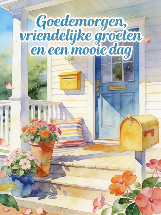 Stuur een vriendelijk goedemorgen bericht met een heldere aquarelveranda, impatiens in beschilderde potten, een vrolijke brievenbus en een gestreept kussen. Deze gastvrije kaart deelt vriendelijke groeten voor een mooie dag, en je kunt ook een goedemorgen bericht voor zijn vrouw op afstand, goedemorgen kusjes of een goedemorgen bericht voor haar man ontdekken.