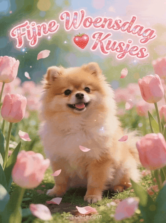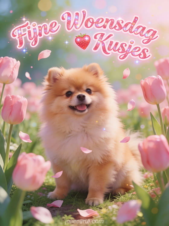 Stuur een lieve vriendschap fijne woensdag kusjes groet via deze gratis wenskaart. Een pluizige Dwergkees puppy omgeven door roze tulpen, een adorable lentetuin scène in pastelkleuren, zoete liefdevolle sfeer met zwevende bloemblaadjes. Bekijk ook een mooie dag fijne woensdag of een kusjes smiley fijne woensdag.