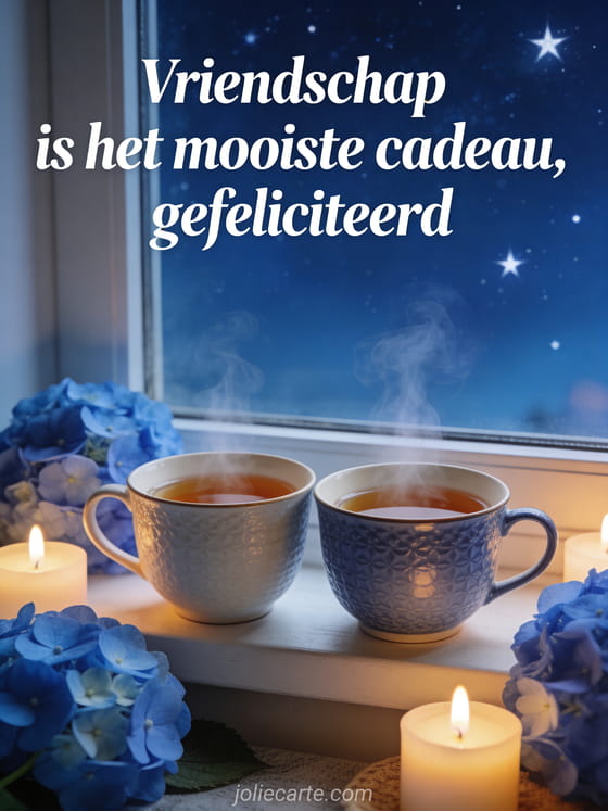 Twee dampende theekopjes bij kaarsenlicht en blauwe hortensias, voor een warme en intieme verjaardagswens. Bekijk ook tekst verjaardag vriendin of verjaardag vriendin.