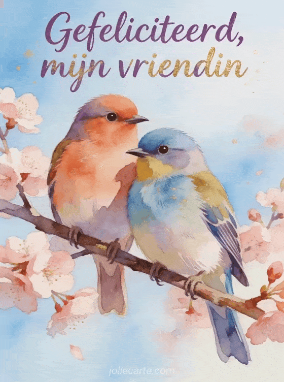 Deel deze lentekaart met twee kleurrijke vogels op een bloeiende kersenboomtak en een warme vriendschapsboodschap. Bekijk ook roos voor verjaardag vrouw, afbeelding gefeliciteerd vrouw gratis en gif humor verjaardag vrouw.