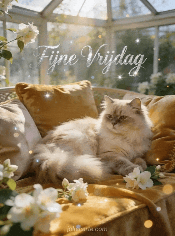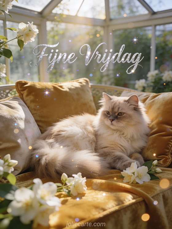 Stuur een stijlvolle vrijdaggroet met een pluizige Perzische kat die luiert op fluwelen kussens in een serre vol jasmijn. Bekijk ook een vrijdag hallo vrijdag of een prachtige fijne vrijdag en fijn weekend.