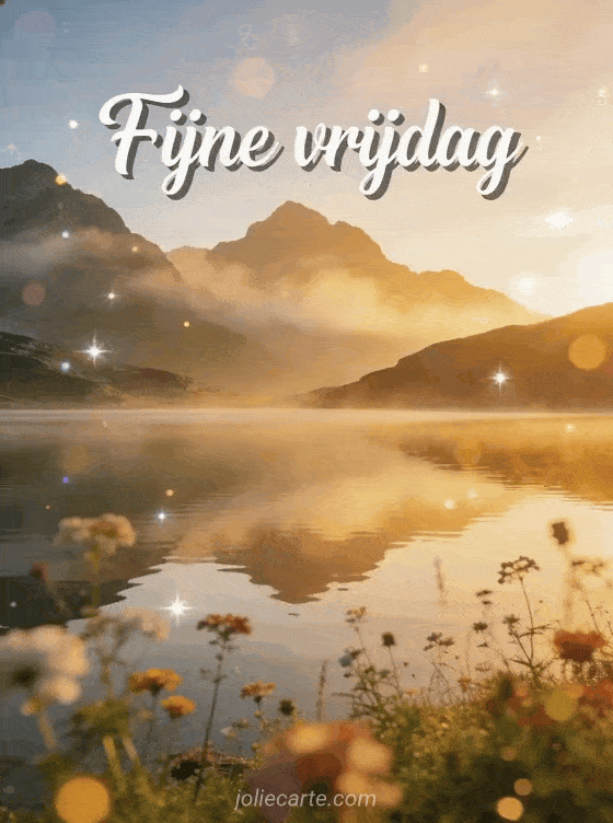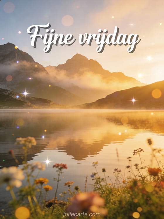 Deel een rustige fijne vrijdagwens met een sereen bergmeer bij zonsopgang, spiegelende reflectie, wilde bloemen en mistige toppen. Ontdek ook een bericht om fijne vrijdag te wensen, fijne vrijdag gratis afbeeldingen of fijne vrijdag dikke kusjes.