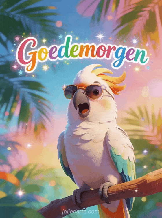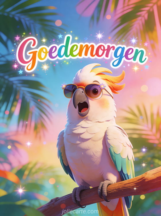 Deel een grappige goedemorgengroet met speelse kleurrijke letters, fonkels en een grappige kaketoe met verbaasde uitdrukking en kleine zonnebril tussen tropische palmbladeren. Ontdek ook een goedemorgen vrijdag landschapskaart, afbeeldingen voor fijne vrijdag of een humorkaart voor fijne vrijdag en fijn weekend.