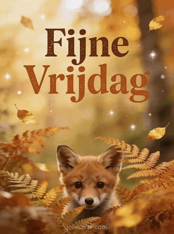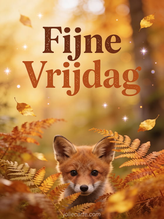 Stuur een herfstachtige vrijdaggroet met een nieuwsgierig vosje dat glurt door herfstvarens met gouden bladeren. Bekijk ook een prachtige fijne vrijdag en fijn weekend of een fijne regenachtige vrijdag.