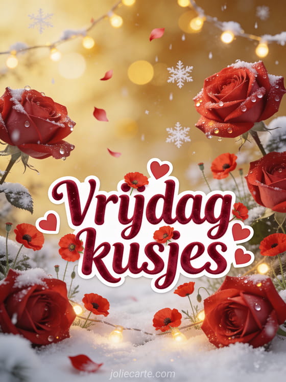 Deel vrijdagkusjes met rode rozen, klaprozen, kleine harten, zachte sneeuwvlokken en een warme gouden gloed. Bekijk ook een goedemorgen fijne vrijdagmorgen, een cyber fijne vrijdag kaart of een mooie afbeeldingen om een fijne vrijdag te wensen.