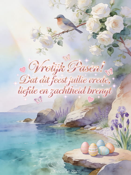 Stuur een serene paaskaart met een vredige rotsachtige baai met kristalhelder turquoise water, een winterkoning op een bloeiende tak van witte rozen boven de baai en paasei gerangschikt op een platte rots. Ontdek ook een gratis virtuele paaskaarten of een pasen wenskaart gratis.
