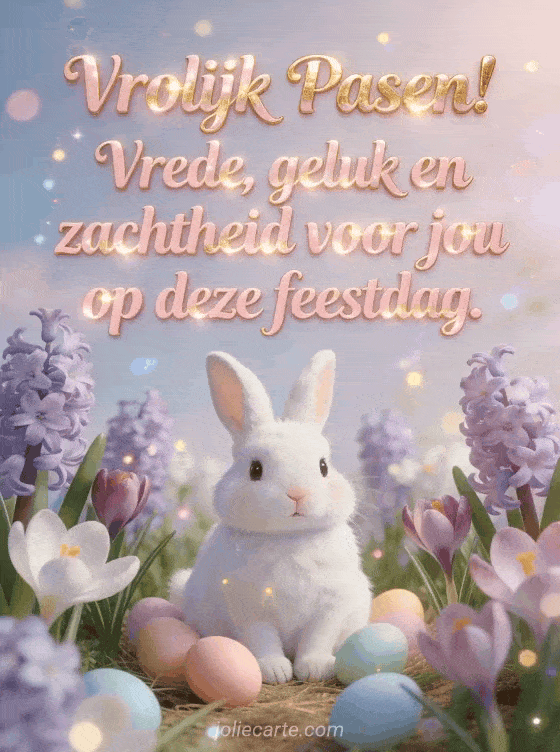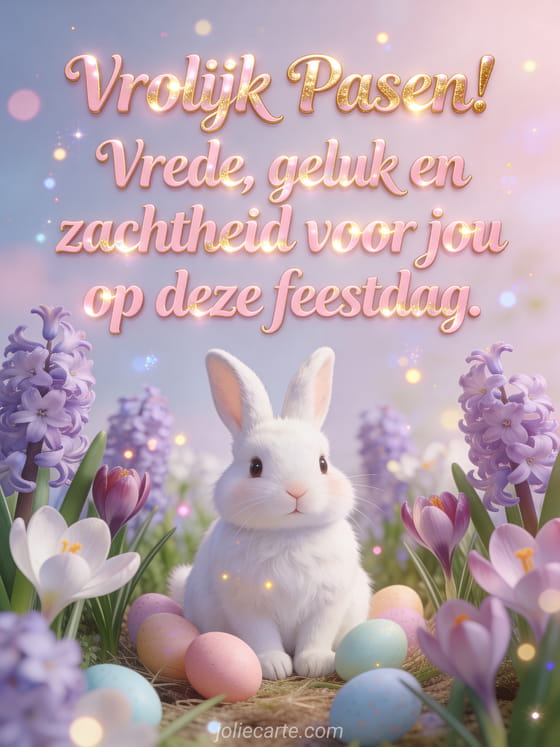 Stuur een mooie vrolijk pasen felicitatie met een teder wit konijn te midden van hyacinten en krokussen. Ontdek ook een bericht voor paasfeest of een bericht voor vrolijk pasen wensen.
