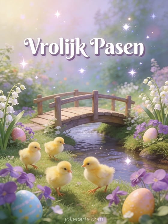 Stuur mooie vrolijk pasen wensen met een sprookjesachtige illustratie van kuikens en muguet. Ontdek ook een paaskaarten of een paasduif.