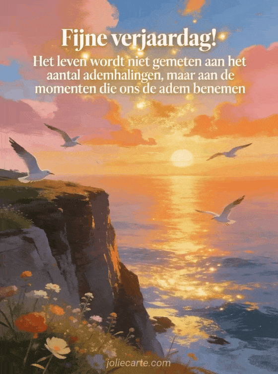 Stuur een inspirerende verjaardagsgedachte met deze ontroerende kaart met een spectaculaire zonsondergang boven de zee, roze en oranje wolken, wilde bloemen en vliegende meeuwen. Ontdek ook leuke tekst om fijne verjaardag te wensen, leuk fijne verjaardag bericht en originele verjaardagszin.