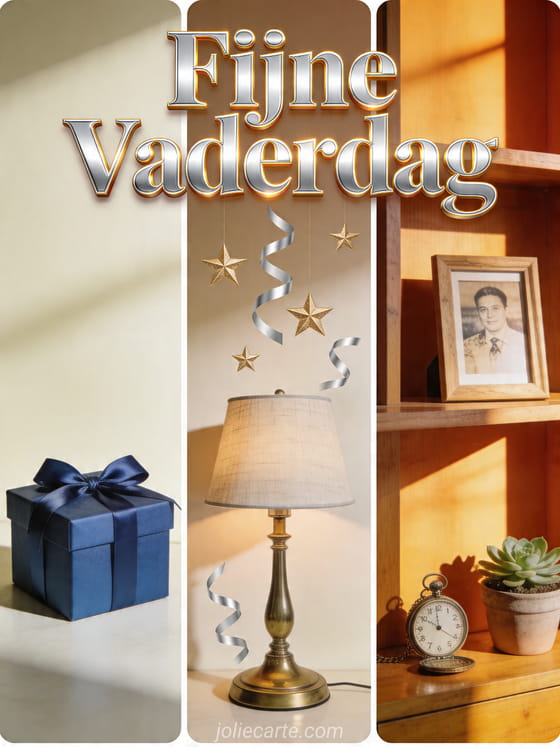 Deel een warme, realistische Vaderdagkaart met een blauwe cadeauverpakking, klassieke bureaulamp en zonovergoten houten plank met kleine herinneringen, linten en sterren. Dit elegante ontwerp is eenvoudig, vrolijk en makkelijk te sturen. Bekijk ook een vaderdagkaart baby, hart Vaderdagkaart of fijne feestdag papa en mama.