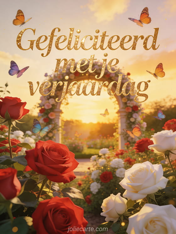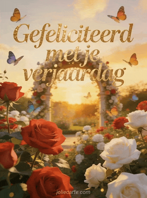 Stuur een romantische vrouwelijke verjaardagsgroet met een prachtige rozentuin en een bloemenboog. Kleurrijke vlinders en het gouden licht van de zonsondergang maken het onvergetelijk. Bekijk ook gif geanimeerd gefeliciteerd verjaardag of verjaardag gif geanimeerd.