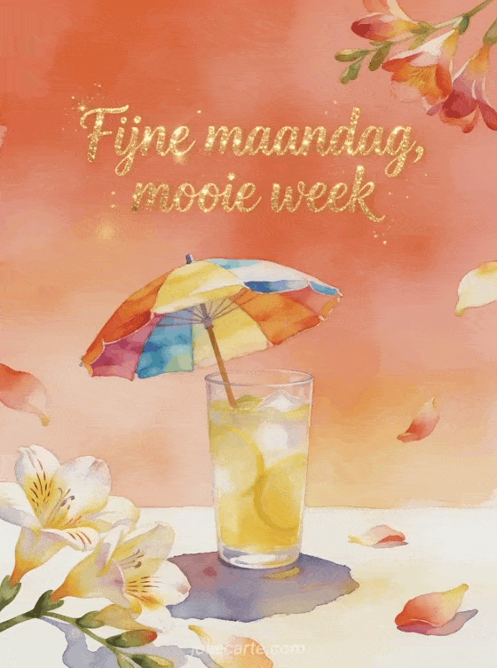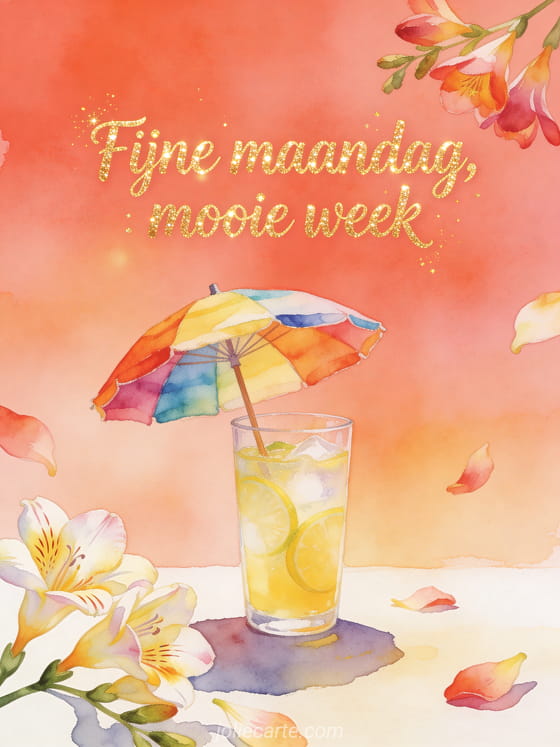 Deel een warme maandaggroet met helder koraalkleurige aquarelletters, gouden glans, een kleurrijke strandparasol, een glas limonade en fresiablaadjes die in zomers licht over de rand komen. Stuur ook een fijne maandag en fijne week geanimeerde gif gif, een maandag goedemorgen kusjes gif of een fijne maandag koffie gif.