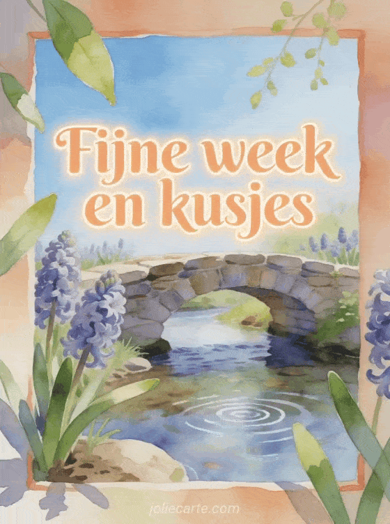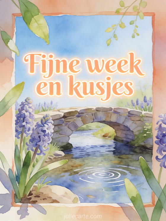 Deel een lentegroet met hyacinttrossen, frisse groene bladeren en een kleine stenen brug over een heldere beek onder een blauwe lucht. Je kunt ook kusjes fijne week, een fijne week kusjes gif of een fijne week kusjes foto sturen.