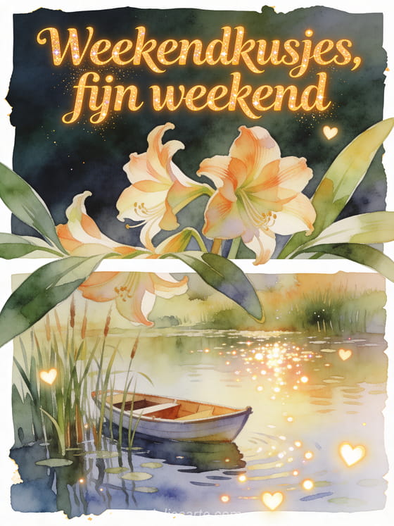 Deel warme weekendkusjes met realistische amaryllis in aquarel, een rustige roeiboot bij riet en fonkelend vijverlicht. Ontdek ook weekend kusjes, fijn weekend dikke kussen afbeelding of grappig fijn weekend humor.