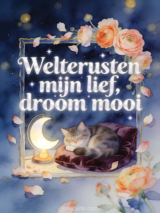 Deel een liefdevol welterusten bericht met een Noorse boskat op een fluwelen kussen, een maansikkel-lamp en ranonkelblaadjes. Ontdek ook een bericht om welterusten te zeggen tegen je lief, een virtuele geanimeerde welterusten kaart of een kaart om welterusten te zeggen.