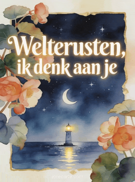 Deel een zacht welterusten bericht met een stralende vuurtoren, een kalme nachtzee, een maansikkel en begonia's. Stuur ook een bericht om fijne nacht te wensen, een welterusten bericht of een kort bericht om welterusten te zeggen.