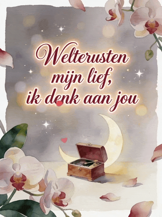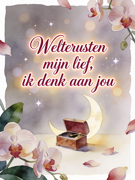 Deel een liefdevol welterusten bericht met een aquarelkaart met een muziekdoos onder een maansikkel, orchideeën en zacht sterrenlicht. Je kunt ook een teder bericht om welterusten te zeggen sturen, welterusten bericht voor je lief kiezen of een welterusten virtuele kaart delen.