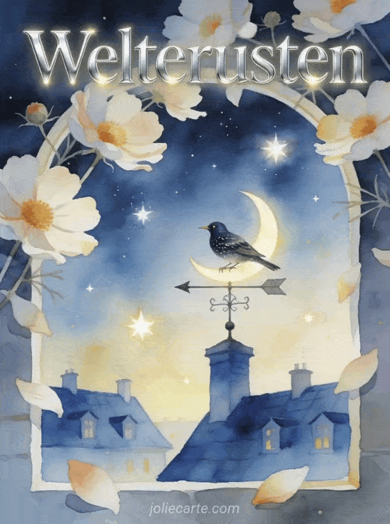 Stuur een kalme welterusten groet met zilveren aquarelletters, kosmosbloemen, heldere sterren en een spreeuw op een halve maan windwijzer boven blauwe daken. Deel ook leuk welterusten bericht, mooi bericht om welterusten te zeggen of welterusten bericht voor haar man.