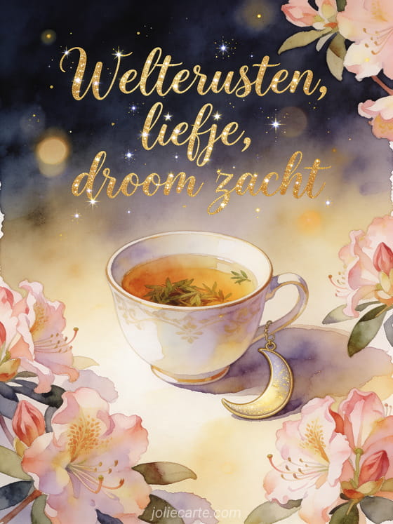 Deel een warm welterustenbericht voor je liefje met een porseleinen kopje kruidenthee, een maansikkelornament en rododendronbloemen in aquarel. Ontdek ook welterusten wens bericht, goede avond welterusten kaart of welterusten e-card.