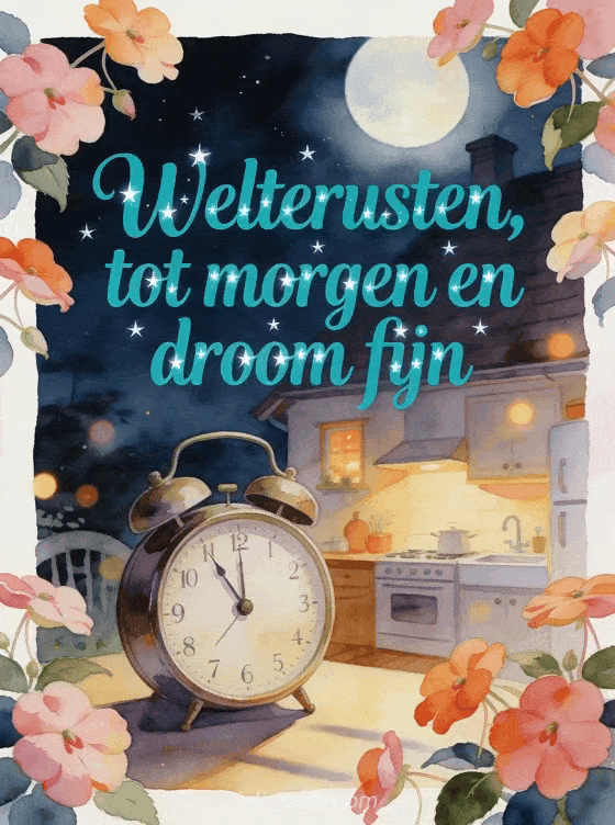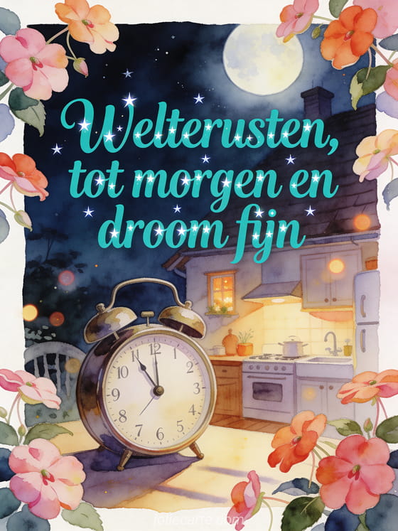Deel een welterusten sms-bericht met turquoise aquarelletters, impatiensbloemen, maanlicht en een ouderwetse wekker in een gezellige cottagekeuken. Je kunt ook een welterusten liefje bericht, een welterusten wens bericht of een goede avond welterusten kaart sturen.