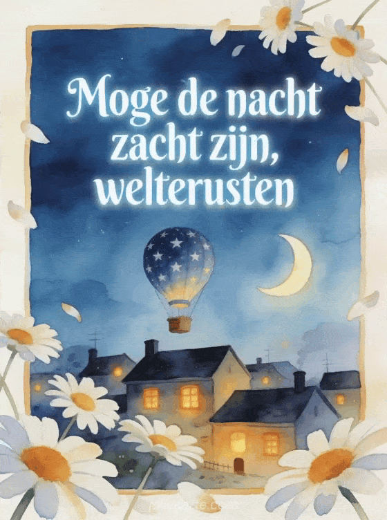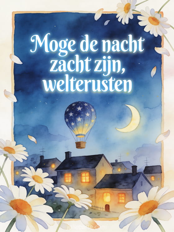 Stuur een zachte welterusten groet met een kleine luchtballon met sterren boven een slapend dorp, een maansikkel en zwevende margrietblaadjes. Ontdek ook een lief welterusten bericht, kaarten fijne avond en welterusten of welterusten wensen.