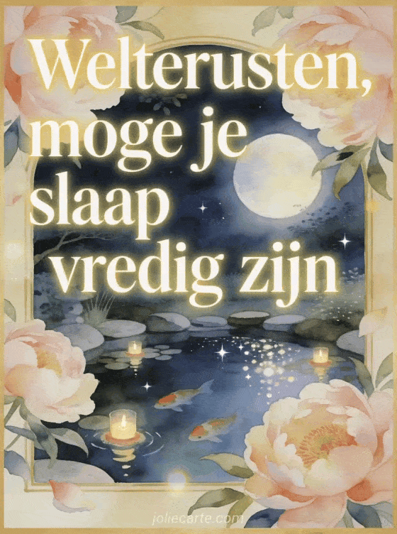 Stuur een rustige welterustenboodschap met bleekgouden letters, pioenroosblaadjes, een maanverlichte koivijver, drijvende kaarsen en sterrenreflecties. Ontdek ook een goede avond welterusten kaart, een welterusten e-card of een virtuele kaart fijne avond welterusten.