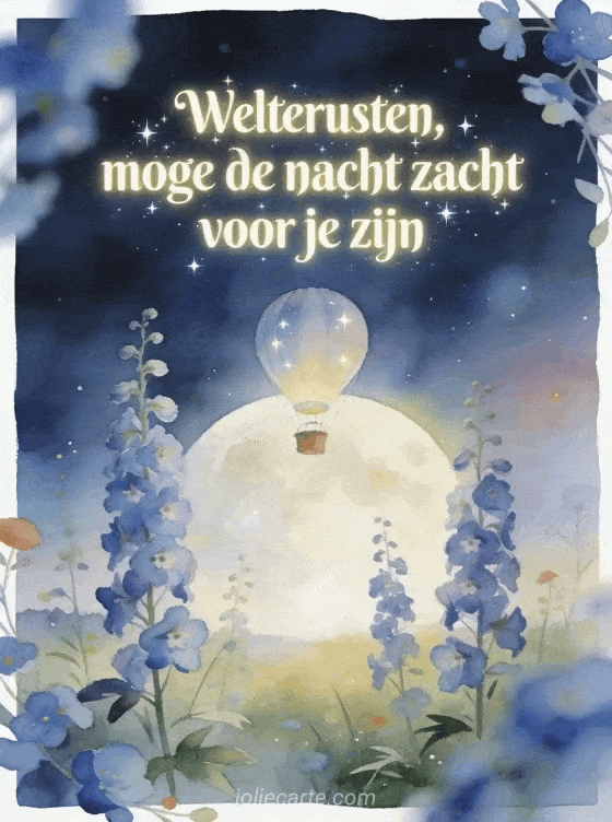 Stuur een dromerige welterustenwens met ivoorkleurige letters, een luchtballon boven een maanverlichte weide, blauwe ridderspoor en zachte bokeh. Ontdek ook gratis geanimeerde virtuele welterusten kaarten, een prachtig welterusten bericht of een welterusten sms-bericht.