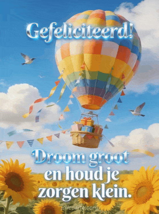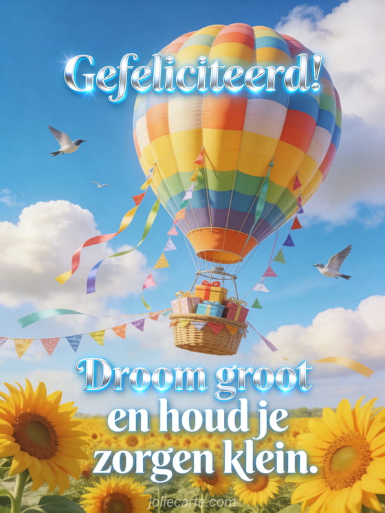 Verras een vriend met deze vrolijke verjaardagskaart met een kleurrijke luchtballon boven gouden zonnebloemen. Ontdek ook een mooi bericht verjaardag voor een vriendin of een bericht verjaardag vriend.