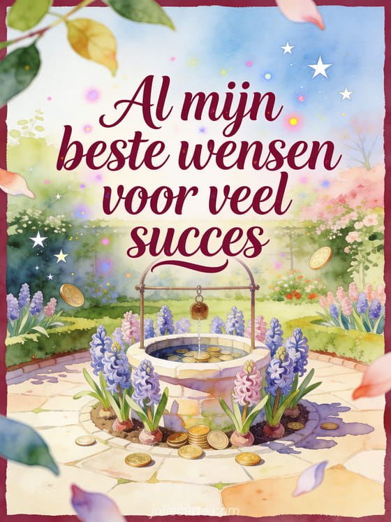 Deel wensen voor veel succes met een heldere wensput omringd door hyacinten, munten, kleine zwevende sterren en een bloeiende binnenplaats. Ontdek ook gratis veel succes afbeeldingen, een tekst veel succes voor wat komt of en vooral veel succes gif.