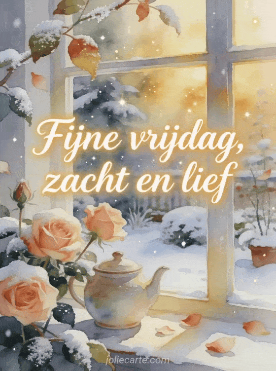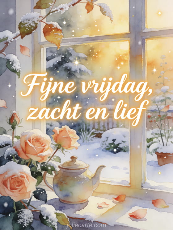Wens een zachte fijne vrijdag met sneeuwbestoven rozen, een keramische theepot en gouden raamlicht in een gezellige wintertuin. Je kunt ook goedemorgen het is vrijdag afbeelding, goedemorgen en fijne vrijdag afbeeldingen of fijne vrijdag mijn liefste afbeeldingen sturen.