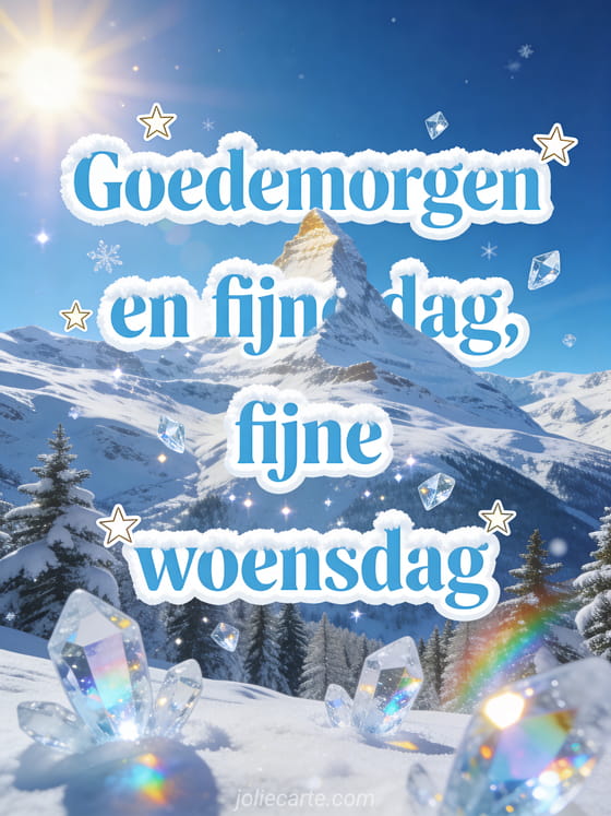 Wens iemand een goedemorgen en een mooie woensdag met deze prachtige alpen-geïnspireerde wenskaart. Bekijk ook een bericht fijne woensdag of een fijne woensdag en fijne dag afbeelding voor meer vrolijke woensdaggroeten.