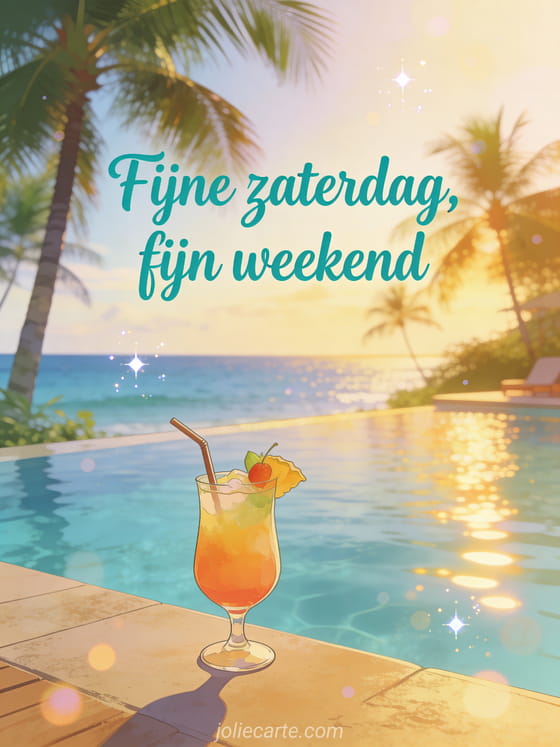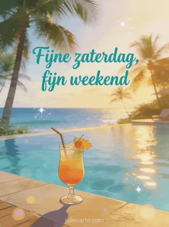 Deel een zonnige fijne zaterdag en fijn weekendgroet met een prachtige infinity pool met uitzicht op de tropische oceaan, palmbomen en een exotische cocktail. Ontdek ook goedemorgen fijne zaterdag afbeeldingen, fijne zaterdag lekker warm of goedemorgen fijne dag fijne zaterdag.