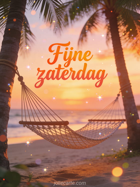 Deel zaterdag fijn weekend met een hangmat tussen palmbomen op het strand in de ultieme ontspannende weekendscène. Houd de zonnige sfeer vast met zaterdag fijn weekend fijne zaterdag, goedemorgen fijne zaterdag afbeeldingen of fijne zaterdag lekker warm.