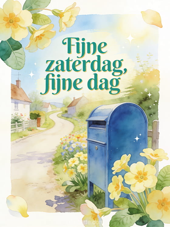 Stuur een gastvrije fijne zaterdag groet met frisse smaragdgroene letters, zachte gouden accenten, een blauwe brievenbus, een slingerend zonnig dorpspad en bloeiende primula's over de rand. Deel ook fijne zaterdag kusjes afbeeldingen, fijne zaterdag winterse afbeeldingen of goedemorgen en fijne zaterdag gifs.