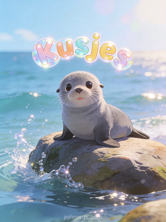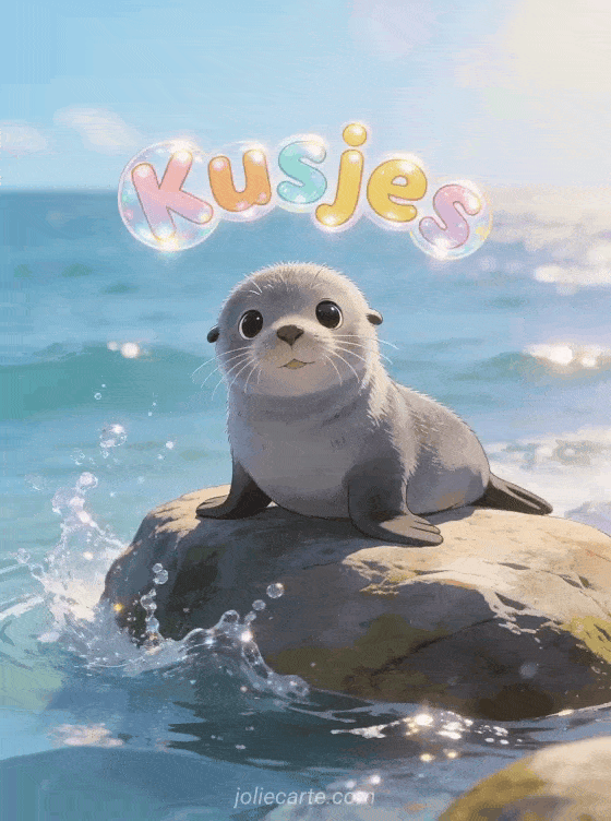 Stuur vrolijke kusjes met deze charmante kaart met een schattige grijze zeehond op een rots aan zee. Ontdek ook kaart dikke kussen of tedere kusjes geanimeerd.