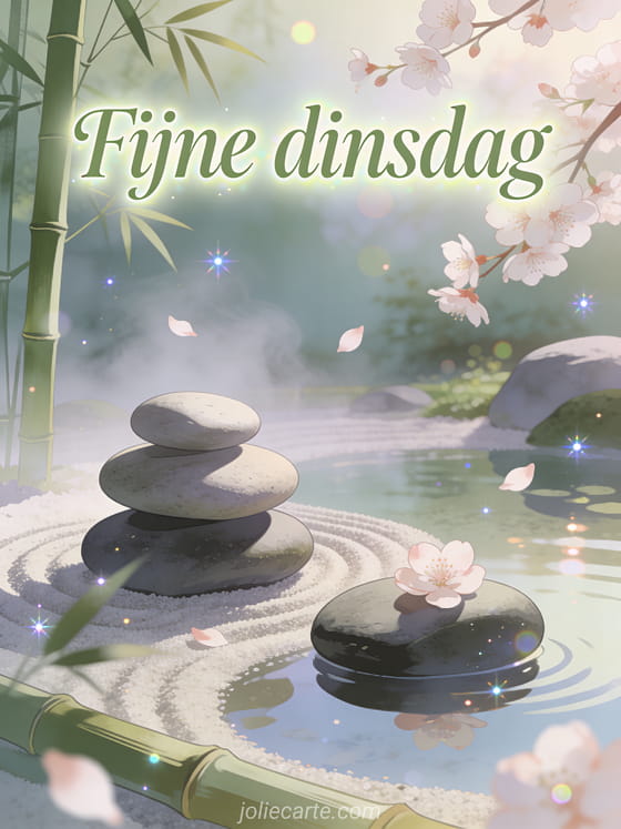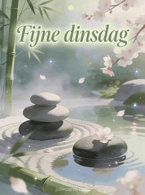 Stuur een rustige fijne dinsdag groet met gladde stenen, zwevende kersenbloesems, bamboe en een zachte saliegroene gloed. Ontdek ook een een fijne dinsdag hebben, een fijne dinsdag en fijne dag gif of een fijne dinsdag kusjes afbeeldingen.