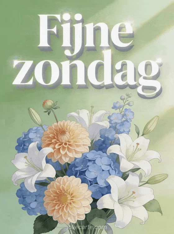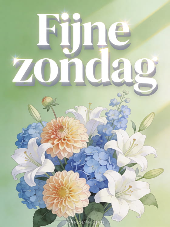 Deel een elegante zondaggroet met een spectaculaire bloemschikking van dahlia's, blauwe hortensia's en witte lelies op een zachte groene achtergrond. Je kunt ook fijne zondag bericht of goedemorgen fijne zondag sturen.