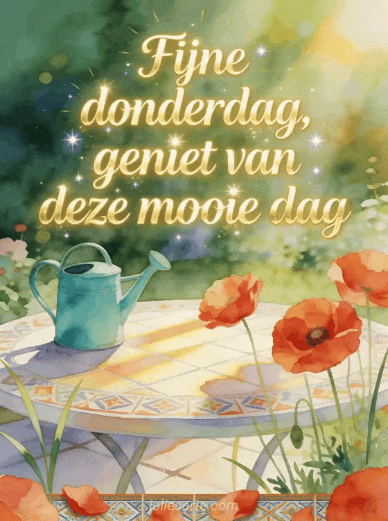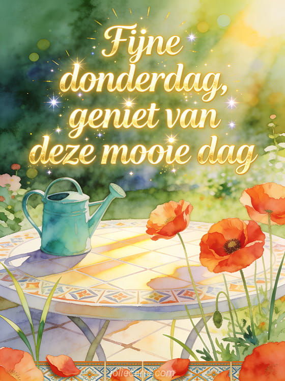 Wens een mooie donderdag met een heldere tuintafel, een turquoise gieter, levendige klaprozen en warme zonnestralen op patroontegels. Bekijk ook afbeeldingen voor fijne donderdag, een fijne donderdag gedicht of een fijne donderdag zegen.