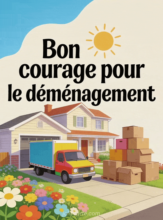 Souhaitez bon courage pour le dĂ©mĂ©nagement Ă un proche qui s'apprĂȘte Ă changer de logement avec une belle image. Envoyez aussi une image pour souhaiter bon courage Ă quelqu'un, pour souhaiter bon courage ou un bon courage gif animĂ©.