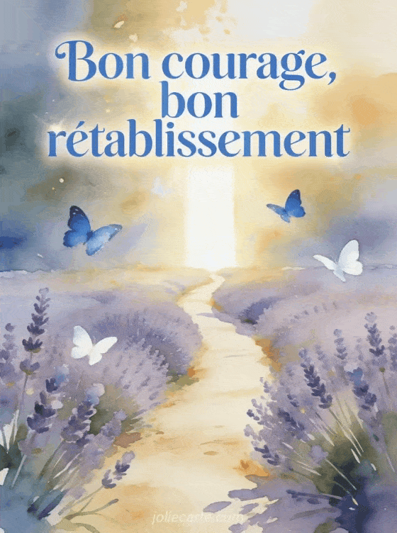 Souhaitez bon courage et rétablissement à un proche avec cette image sereine et lumineuse. Découvrez aussi un bon rétablissement mon amour je t'aime, une carte prompt rétablissement ou un bon rétablissement mon chéri.