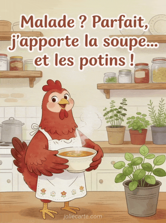 Partagez cette carte de bon rĂ©tablissement humoristique avec une poule adorable prĂȘte Ă apporter soupe et potins au chevet du malade. DĂ©couvrez aussi un bon courage rigolo, un rĂ©tablissement humoristique ou un prompt rĂ©tablissement drĂŽle.