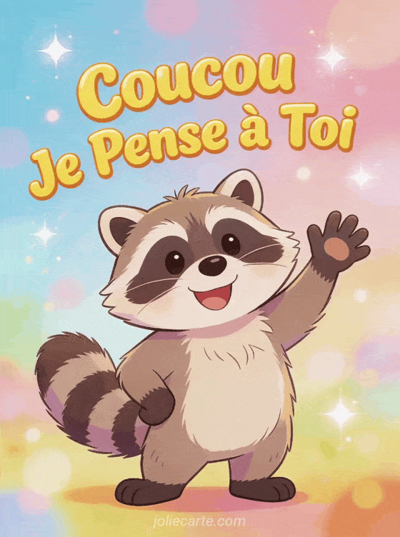 Envoyez ce gif « Coucou Je Pense à Toi » avec un raton laveur rigolo pour faire sourire quelqu'un. Variez avec un gif animé, un message d'amour ou une pensée intense.
