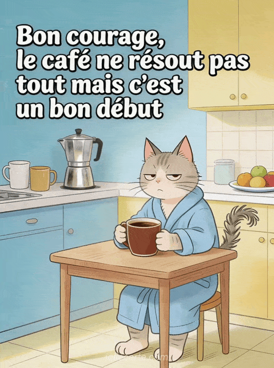 Bon courage, le café ne résout pas tout mais c'est un bon début un gif bon courage plein d'humour pour dédramatiser