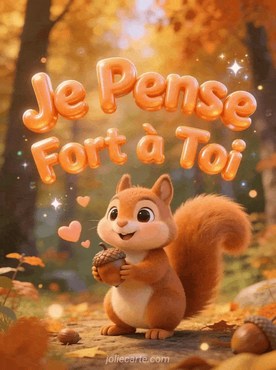 Partagez ce gif « Je Pense Fort à Toi » avec un écureuil adorable pour une pensée chaleureuse. Découvrez aussi un poÚme romantique, un gif fleuri ou une pensée onirique.