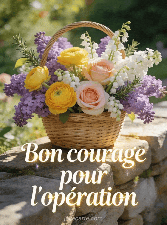Envoyez cette image printanière pour souhaiter bon courage avant l'opération. Un panier fleuri pour transmettre votre soutien, à voir aussi avec une carte rétablissement, un message rétablissement ou un gif courage opération.
