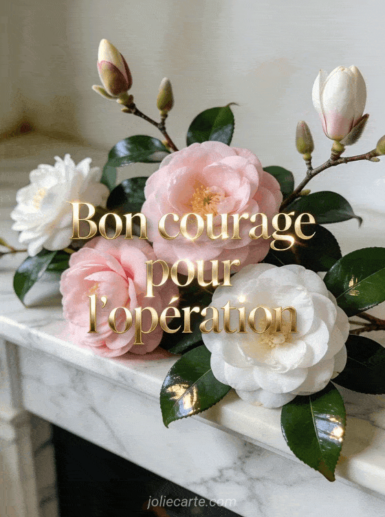 Envoyez cette image de camélias pour souhaiter bon courage avant une opération. Un visuel raffiné et apaisant, à voir aussi pour souhaiter courage opération, un message courage opération ou un courage avant opération.