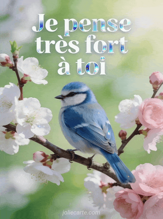 Partagez cette image de mésange « Je pense très fort à toi » pour envoyer une pensée délicate. Variez avec un message nocturne, un mot de bisous ou une pensée sincère.