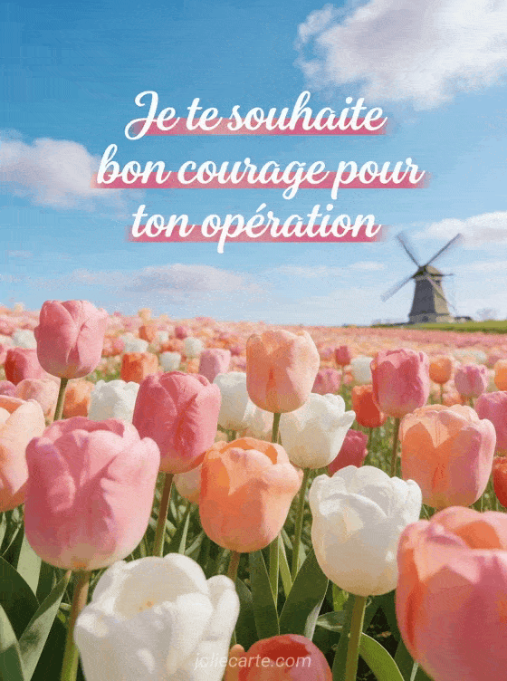 Partagez cette carte colorée pour souhaiter bon courage avant une opération. Des tulipes printaniÚres et un message sincÚre, à voir aussi avec une carte opération chirurgicale, une image courage opération ou un courage hÎpital humour.