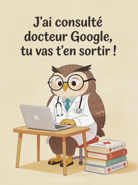 Partagez ce prompt rétablissement humoristique avec une chouette docteur qui a tout vérifié sur Google. Découvrez aussi un gif rétablissement humour, une carte humour gratuite ou un message humoristique.